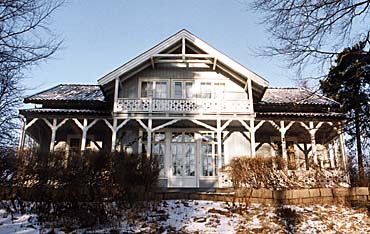 Oslo: Punschebollen, Furulundsveien 7 Sommervillaen Punschebollen ble bygget omkring 1856 etter tegninger av arkitektene Heinrich Ernst Schirmer og Wilhelm von Hanno. Huset ble oppført for bankieren Thomas Johannessen Heftye, som kjøpte løkkeparsellen ved Frognerveien i 1838. Navnet Punchebollen stammer opprinnelig fra en større løkkeeiendom, med et hovedhus fra 1700-tallet som lå like ved dagens Bygdøy allé. Huset var blant annet traktørsted. Huset fikk med tiden adressen Frognerveien 30, og sto på denne tomten til 1916, da det ble flyttet til den nåværende beliggenhet i Furulundsveien. I 1923-26 ble en ny leiegård oppført her, etter tegninger av arkitekt Kristen Rivertz. Amtmand Ole Andreas Furu bekostet flyttingen av trevillaen, og fikk den nødvendige arkitektbistand til dette av Halfdan Berle og Ulf Berbom. Ved flyttingen ble de fleste utvendige detaljer bevart. Plassen som ligger ved Frognerveien 30 fikk i 1987 navnet Amtmann Furus plass. Punschebollen er en symmetrisk komponert sveitservilla i den tidlige variant av stilen. Midtpartiet er rykket frem i to etasjer med spiss gavl og veranda. Terrassen er overbygget i hele husets lengde, med et pulttak som er løsrevet fra husets sadeltak. Terrasserommets kortvegger er for en stor del utført i glass. Husets vinduer har i øvre ramme et sprossekryss med en rombe i midten. Dette elementet ble anvendt av Schirmer ved flere anledninger, blant annet på sommerhuset Bernhard Dunkers sommerhus på Malmøya (1847, nedbernt). Denne detaljen finnes også i Schwensens gate 11, der arkitekten ikke er identifisert.