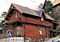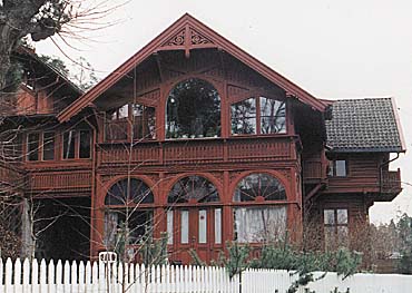 Oslo: Augustenborg, Ljabruveien 42 Denne spennende sveitservillaen ligger idag utsatt til, kloss inntil Ljabruveien. Den ble bygget i 1884 for bøkker Jørgensen, og har en spesiell, sammensatt form. Bjelkeverk og utskjæringer har en form som var vanlig på 1870-80-tallet, med store buede vinduer i det dominerende parti, der vinduene i annen etasje er gitt en gotiskpåvirket form. Ellers er villaen ikke panelt utvendig, og har dermed et hovedpreg av nasjonal tømmerstil. Hattemaker Hans H. Holm overtok huset etter bøkkeren. I 1903 sto hans kone, fru Lydia Holm, som eier. En av deres sønner, nasjonalskalden Hans Henrik Holm, bodde en tid her, sammen med sin kone, Frøydis Haavardsholm. Villaen består idag av to sammenbyggede hoveddeler. Opprinnelig varden bakre delen et uthus, men man lot disse kobles sammen omkring 1900. Innen dette var et karnapp bygget til i 1897, ved arkitekt Alfred Christian Dahl.
