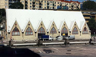 Fra Göteborgs arkitekturhistorie: Fiskhallen (Feskekörka) I 1870 ble det søkt om midler fra Sven Renströms fond for å få reist en salgshall for fisk. Arkitekt Victor von Gegerfelt hadde tegninger klare i 1872, og 1. november 1874 kunne den såkalte Feskekörka innvies. Hallen er konstruert over Gegerfelts karakteristiske triangelprinsipp, der de bærende kontruksjoner har et triangulært snitt. Konstruksjonen er både påvirket av norske stavkirker og gotiske stenkirker, og hallens stilpreg bærer tydelige slektskap med de middelalderske forbilder. Spissgavlene med spissbuede vinduer danner hva man kan kalle hallens fasade. Bygningens sakrale preg er utvilsomt opphav til dens folkelige kallenavn.