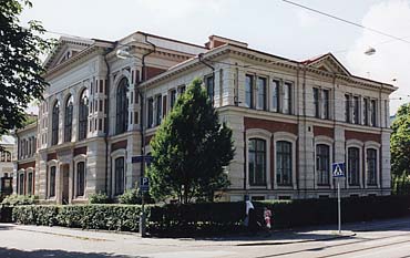 Fra Göteborgs arkitekturhistorie: Handelsinstitutet, Läroverksgatan 6 Göteborgs Handelsinstitut ble grunnlagt i 1826, som den første høyere handelsskole i Sverige. Det første halve hundreåret tok man til takke med å leie lokaler, men i 1881-82 flyttet man inn i et nybygg ved Läroverksgatan. Nybygget ble oppført etter tegninger av arkitekt Adrian Crispin Peterson. Etter en del år under navnet Levgrenska Gymnasiet har Göteborgs Handelsinstitut inngått i Hvitfeldtska Gymnasiet. Handelsinstitutet er utført i en monumental nyrenessansestil med et markant midtparti i hovedfasaden. Risalitter, gavloppbygg og kraftige hjørnekvadre preger denne symmetrisk anlagte bygningen. Fasadene er kraftig, men enkelt ornamentert, og veggflatene er utført i upusset rød tegl.