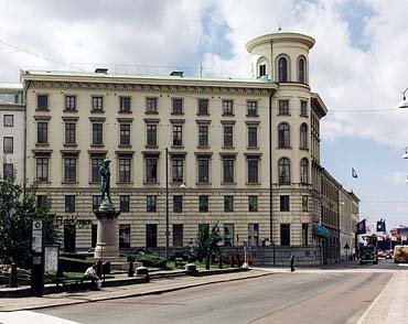 Fra Göteborgs arkitekturhistorie: Wijkska hus, Lilla Torget 1 På dette sted lå et av Göteborgs første stenhus Det Utfallska huset fra 1689. Huset brant ned i 1804, og eiendommen ble liggende brakk i flere tiår. Kommersråd Olof Wijk den eldre kjøpte eiendommen og engasjerte arkitekt Victor von Gegerfelt til å utforme sitt bolig- og forretningshus. Arkitekt Adolf Wilhelm Edelsvärd bearbeidet og forenklet i 1851 Gegerfelts tegninger fra året før, og det var Edelsvärd som ledet byggingen av huset. Det Wijkska hus sto ferdig i 1853. Huset forble i slekten Wijks eie til 1925, da det ble solgt til brann- og livsforsikringsaksjeselskapet Svea, som lot ombygge gården noe i 1929. Dette innebar en påbygging av én etasje, samt flytting av inngangsporten. Huset er utført i en enkel, senklassisistisk stil. Det markante hjørnetårnet danner bygningens kompositoriske tyngdepunkt, og et praktfullt fondmotiv for kanalen. Huset har regelmessige vindusakser, og de to nederste etasjene danner en tung, kvaderpusset sokkel.