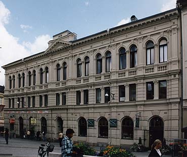 Fra Göteborgs arkitekturhistorie: Abrahamssons lagerlokal, Östra Larmgatan 16 A. Abrahamssons lagerlokal er en forretningsgård oppført omkring 1880 etter tegninger av arkitekt Adrian Crispin Peterson. Bygningen fremstår som en gedigen bygård, med en tung sokkel med store vindusåpninger og enkel kvaderpuss. Lagermesaninen og den luftige toppetasjen er knyttet sammen kompositorisk, med parstilte vinduer. Vinduene i den rikt dekorerte toppetasjen er høye og rundbuede. Stiluttrykket er nyrenessanse. Her har det engelske generalkonsulatet hatt tilhold. Idag er huset forretnings- og kontorlokaler.