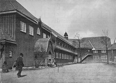 Jubileumsutstillingen i Kristiania, 1914: Landbruksbygningen Landbruksbygningen ble oppført ved Landbruksplassen etter tegninger av arkitektene August Nielsen og Rudolf Emanuel Jacobsen. Bygningen hadde en kraftig, enkel form, og det meste av fasadelengden hadde en utkraget svalgang med kraftige, utskårne stolper. Hovedinngangens mansardbaldakin er preget av norsk trearkitektur fra barokken. Bygningen inngår i arkitektenes helhetlige tilnærming til det nasjonalromantiske barokkuttrykk innen panelarkitektur.