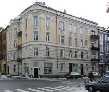 Arkitektur og historie i Oslo: Eckersbergs gate 15 Denne hjørnegården ble byggemeldt i 1898 på en parsell av Frognergaden 11b (Nobels gate) av infanterisersjant og kontorbud Nikolai Olsen Braathen ved arkitekt Oskar Dehkes. Gården er bygget i pusset tegl over fire etasjer, og har gatefasader sammensatt av symmetriske og asymmetriske partier. Hjørnepartiet danner en egen komposisjon, mens det øvrige av fasaden mot Eckersbergs gate består av en smal enhet med et midtstilt polygonalt karnapp. Hoveddelen mot Erling Skjalgssons gate har en enkel symmetrisk komposisjon, men med asymmetrisk plasserte balkonger og innganger. De to nederste etasjene er knyttet sammen, og har enkel kvaderpuss i fasaden. Tredje og fjerde etasje knyttes sammen med vertikale bånd. Disse etasjene har rik dekor, og gesimsen er trukket ned slik at den danner et bredt bånd. Stiluttrykket er nybarokk. I nyere tid er det bygget loftsleiligheter her. Blant gårdens 51 beboere fordelt på ti leiligheter ved folketellingen anno 1900 var, foruten gårdeier Braathen og hans familie, overrettssakfører Sigurd Holaker, tegner Hilda Bay, kommandersersjant Hans B. Olsen og pianoagent Iver Andreas Joakim Mordt.