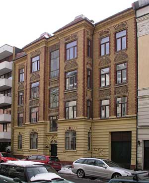 Arkitektur og historie i Oslo: Eckersbergs gate 17 Denne gården ble byggemeldt i 1898 på en parsell av Frognergaden 11b (Nobels gate) av Edvard Refsum fra Sørum ved arkitekt Sigurd Reidolph Gulbransen. Gulbransen tegnet også nr. 19 for Refsum. Denne ble bygget samtidig, men er senere revet. Eckersbergs gate 17 er bygget over fire etasjer med gatefasade i gul tegl, med kvaderpusset første etasje. Fasaden er symmetrisk komponert, med store trappevinduer langs midtaksen, flankert av to karnapper. Portrommet har en asymmetrisk plassering. Ornamentale virkemidler oppnås ved bruk av rød tegl ved hjørner og vinduer, samt stukk i vindusoverdekningene. Stiluttrykket er nybarokk. Loftet er innredet i nyere tid. Blant gårdens 43 beboere fordelt på åtte leiligheter ved folketellingen anno 1900 var skogkonsulent i Landbruksdepartementet Michael Saxlund, bokholderske Harda Deichmann-Sørensen, handelsreisende Lorentz Ferdinand Henriksen og handelsagent Jens Fischer.