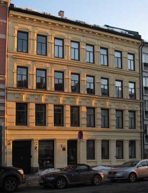 Arkitektur og historie i Oslo: Eckersbergs gate 39 Denne beskjedne leiegården ble byggemeldt i 1896 på en tomt skilt ut fra Frognerveien 40 for byggmester Johan Olsen ved arkitekt Georges Heinecke. Olsen fikk to år tidligere oppført gårdene i Eckersbergs gate 41 og Frognerveien 42, begge ved arkitekt Carl Aaman, og begge med samme fasadeutstyr som er benyttet her i Eckersbergs gate 39. Gården er bygget i pusset tegl over fire fulle etasjer, med en gatefasade komponert med åtte regelmessige vindusakser. Første etasje skiller seg litt ut, med asymmetrisk plassering av portrom og inngangsdør. Her er aksene adskilt av enkle pilastre. I annen etasje er fasaden kvaderpusset i svært kraftig relieff. Tredje og fjerde etasje har profilerte og brutte vindusomramminger med enkle, geometriske overdekninger. Stiluttrykket er eklektisk historisme preget av nybarokk. I 1899 var gården eiet av en O. Fjelsta, og året etter levde en Andrea Berntsen ”Af indtægter af Gaarden”. I 1944 ble huset underlagt reparasjoner på grunn av skader forårsaket av Filipstad-ulykken den 19. desember 1943.
