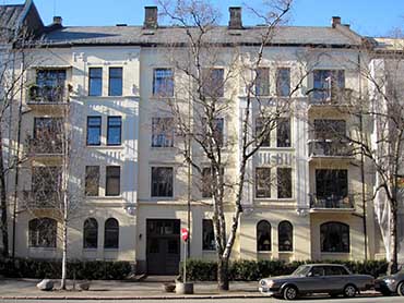 Arkitektur og historie i Oslo: Elisenbergveien 16 Denne gården ble byggemeldt i 1909 for iseksportør Thomas Johannes Wiborg fra Brevik, med ansvarshavende C. Blunck, ved arkitekt Eduard Carlén, på en tomt opprinnelig skilt ut fra Frognerveien 48. Første byggemelding på tomten ble innsendt allerede i 1899 for Wiborg ved arkitekt Einar Raaum, men dette prosjektet stanset opp under eiendomskrakket samme år. I denne perioden sto tomten oppført i Elisenberg Aktieselskabs eie. I 1912 var gården fremdeles i Wiborgs eie. Elisenbergveien 16 er oppført i pusset tegl over fire fulle etasjer, og har en grunnleggende symmetrisk komponert gatefasade uten markert midtakse. Portrommet er asymmetrisk plassert. Fasaden domineres av to siderisalitter, med smijernsbalkonger i ytterkant. I første etasje er vindusformene varierte, med rektangler, stikkbuer og små rundbuer. Ellers har gården rektangulære vinduer med smårutede toppfelt. I første etasje er veggflatene delvis kvaderpusset i grunt og sirlig relieff, mens de ellers er glattpussede. Artikuleringen er sparsom, men i risalittpartiene står grunne, stiliserte kolossalpilastre over kartusjkonsoller, kronet med gipskrukker. Her finnes også enkle vertikale fordypninger i pussflatene. Stiluttrykket er nybarokk med trekk fra ny-Louis-Seize og jugendstil. I gården kunne man omkring 1917 motta engelskundervisning fra miss Flora King.