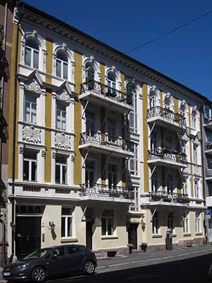 Arkitektur og historie i Oslo: Erling Skjalgssons gate 20 Denne gården ble oppført i 1898-99 for Emil Ruud, ved arkitekt Sigurd Reidolph Gulbransen, på en tomt skilt ut fra Frognergaten (Nobels gate) 11b. Gården er oppført i upusset og pusset tegl over fire fulle etasjer, og har en grunnleggende symmetrisk komponert gatefasade. I første etasje brytes den overordnede symmetrien av portrommets plassering, samt en gammel butikkdør. Her har opprinnelig veggflatene vært kvaderpussede. Trappegangens store vinduer avsluttes oventil av en stor rundbue flankert av kolossalpilastre, og danner fasadens dominerende midtakse. Denne flankeres av smijernsbalkonger. I annen til fjerde etasje er ytterveggene forblendet med gul tegl av første sortering, et materiale typisk for området og epoken. Vinduene omsluttes av kraftig stukkatur. Tredje etasjes brystningsfelter prydes av byggherrens initialer E. R., og over disse leder kanellerte pilastre opp til spisse, gavlformede overdekninger. Fjerde etasjes rundbuede vinduer har ansiktsmasker i de overdekkende sluttstensetterligningene. Takgesimsen domineres av buede konsoller. Stiluttrykket er senhistorismens eklektiske nybarokk. Ved rehabilitering er balkongenes opprinnelige konsoller skiftet ut med lange støttestag. Ved folketellingen anno 1900 hadde gården 47 beboere fordelt på ni leiligheter. Her bodde blant andre kullhandler Hager Edmund Jordan, kassererske i fotografforetning Ragnhild Gundersen, handelsagent Christian Jørgen Henschien og postekspeditør Fredrik Hansen. Gården ble med tiden omgjort til et aksjeselskap ved navn Erling Skjalgssons gate 20, en eiendom som i 1916 ble solgt til aksjeselskapet Asdave for kr. 160 000. I 1917 averterte Rosa Reinholdt for sine tjenester innenfor sykegymnastikk fra gården.