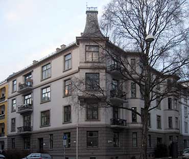 Arkitektur og historie i Oslo: Waglekomplekset: Jacob Aalls gate 44 Denne hjørnegården til Åsaveien ble byggemeldt i 1902 for et konsortium ledet av bruksdirektør Friedrich Richard Roedel, ved arkitekt Morten Wagle. Konsortiet lot også oppføre Åsaveien 15, Jacob Aalls gate 46, Suhms gate 16 samt Kirkeveien 77 og 79, alle bygget i årene 1901-05, og tegnet av arkitekt Wagle. Disse bygårdene utgjør til sammen et helt kvartal. Arkitekten var i 1912 eier av to av disse eiendommene. Dette antyder at han deltok i det opprinnelige byggekonsortiet som medeier. Wagle var dessuten kontaktperson ved annonsering av utleieboliger her ved gårdens ferdigstillelse, og involvert i selskapets direksjon. Direksjonens øvrige medlemmer i 1906 var den ovenfornevnte bankdirektør Roedel samt Wilhelm Ernst Krüger, begge bosatt i tyske Rathenow. Kvartalet, eller ”Bygningskomplexet”, hadde et eget utleiekontor i Suhms gate 16, og opererte fra 1906 under navnet Westend. Senere ble kvartalet også omtalt som Waglekomplekset. Jacob Aalls gate 44 er bygget i pusset tegl over fire fulle etasjer, med et brukket hjørne, som har et hengende karnapp. Fasaden mot Jacob Alls gate er tilnærmet symmetrisk. Den domineres av to polygonale karnapper i full gesimshøyde. Smijernsbalkongene i venstre akse utgjør et lite brudd med symmetrien. Fasaden mot Åsaveien er enklere. Også her etterstrebes en grunnleggende symmetri i komposisjonen, men igjen er balkongene forskjøvet til venstre. Bygningens hovedmotiv er imidlertid det hengende hjørnekarnappet, med dets steile, sterkt krummede tårnhjelm, med skiferkledning og smijernsgrind. Første etasje har rustikert kvaderpuss, og de øvrige etasjene har glattpussede flater og enkelt artikulerte vinduer. Et gesimsbånd skiller fjerde etasje fra de øvrige. Gatefasadene er kantet med pusskvadere, og den smale hovedgesimsen er sirlig artikulert. Stiluttrykket er en meget forenklet nybarokk. Ved folketellingen anno 1910 hadde gården 52 beboere fordelt på 12 leiligheter. Blant dem var departementssekretær Lars Klæboe, advokat Hans Olai Fremming Heyerdahl, grosserer og innehaver av skrivemaskinforretning Martinus Nissen-Lie, ingeniør ved patentkontor Mogens Fraas Bugge og maskiningeniør Kristofer Henrik Hoelfeldt Lund.