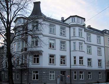 Arkitektur og historie i Oslo: Waglekomplekset: Jacob Aalls gate 46 Denne hjørnegården til Suhms gate ble byggemeldt i 1903 for et konsortium ledet av bruksdirektør Friedrich Richard Roedel, ved arkitekt Morten Wagle. Konsortiet lot også oppføre Åsaveien 15, Jacob Aalls gate 44, Suhms gate 16 samt Kirkeveien 77 og 79, alle bygget i årene 1901-05, og tegnet av arkitekt Wagle. Disse bygårdene utgjør til sammen et helt kvartal. Arkitekten var i 1912 eier av to av disse eiendommene. Dette antyder at han deltok i det opprinnelige byggekonsortiet som medeier. Wagle var dessuten kontaktperson ved annonsering av utleieboliger her ved gårdens ferdigstillelse, og involvert i selskapets direksjon. Direksjonens øvrige medlemmer i 1906 var den ovenfornevnte bankdirektør Roedel samt Wilhelm Ernst Krüger, begge bosatt i tyske Rathenow. Kvartalet, eller ”Bygningskomplexet”, hadde et eget utleiekontor i Suhms gate 16, og opererte fra 1906 under navnet Westend. Senere ble kvartalet også omtalt som Waglekomplekset. Jacob Aalls gate 46 er bygget i pusset tegl over fire fulle etasjer, med et brukket hjørne, som har et hengende karnapp. Fasaden mot Jacob Alls gate er symmetrisk komponert. Den domineres av to polygonale karnapper i full gesimshøyde, og har smijernsbalkonger i de ytre flankene. Fasaden mot Suhms gate er enklere. Også denne er symmetrisk komponert, men her dannes midtaksen av et enkelt, polygonalt karnapp. Bygningens hovedmotiv er imidlertid det hengende hjørnekarnappet, med dets steile, sterkt krummede tårnhjelm, opprinnelig med skiferkledning og smijernsgrind. Første etasje har rustikert kvaderpuss, og de øvrige etasjene har glattpussede flater og enkelt artikulerte vinduer. Et gesimsbånd skiller fjerde etasje fra de øvrige. Gatefasadene er kantet med pusskvadere, og den smale hovedgesimsen er sirlig artikulert. Stiluttrykket er en meget forenklet nybarokk. I 1985 ble loftet utbygget for beboelse, og i den forbindelse ble karnappene forhøyet med én etasje. Ved folketellingen anno 1910 hadde gården 50 beboere, fordelt på 12 leiligheter. Blant beboerne her på den tiden var arkitektens bror, byggmester Lorentz Christian Wagle, skipsreder Christian Thorvald Gogstad, premierløytnant Karl Lous, fabrikant og farmasøyt Frode Lieungh og assistent i Kirkedepartementet Johanne Blom.