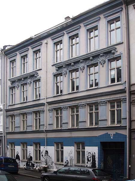 Arkitektur og historie i Oslo: Jens Bjelkes gate 4 Denne gården ble byggemeldt i 1899 for eiendomsspekulanter og murmestre Alexius Emanuel Steene og Iver Magnus Bjerke, ved arkitekt Matheus Mosgaard. Gården ble oppført på en tomt skilt ut fra Sverdrups gate 8. Den inngår i kvartalet som avgrenses av Sverdrups gate, Jens Bjelkes gate, Rathkes gate og Kirkegårdsgaten, hvor alle bygningene med unntak av Kirkegårdsgaten 10 og Sverdrups gate 10 ble tegnet av Mosgaard for Steene & Bjerke. Gården er oppført i pusset tegl over fire fulle etasjer. Fasaden er uregelmessig komponert, med grupperte vindusakser, med grupper på tre og fire vindusakser. Første etasje var opprinnelig kvaderpusset, men er senere betydelig forenklet. Annen etasjes vinduer flankeres av butte pilastre, som leder opp til tredje etasjes stukkbelistning. Tredje etasjes overdekninger har en bemerkelsesverdig utforming, som er karakteristisk for arkitekt Mosgaards gårder i kvartalet. Sluttstenene i stukk danner konsoller for overdekningene, som er trukket inn fra vinduenes flanker, Under overdekningene er store kartusjer omkring våpenskjold som bærer bokstavene "B" og "S", som i byggherrenes etternavn. Øverst ligger enkle overdekninger og en svært smal gesims. Stiluttrykket er en eklektisk senhistorisme preget av nybarokk. År 1900 ble det oppført et klosettskur i bakgården, og i 1988 ble det anlagt en takterrasse. De flate fasadepartiene er delvis dekket av fliser, lagt i et mønster preget av postmodernismens uttrykk. Nedenfor disse er fasaden utsmykket med et maleri utført av den britiske kunstneren Ian Dent. Ved folketellingen anno 1900 hadde denne nylig ferdigstilte gården 38 beboere fordelt på åtte leiligheter. Blant leieboerne her på den tiden var politikonstabel Hans Wifladt, notlejomfru (sømarbeiderske på skofabrikk) Ragna Sandaas, brødkjører Helmer Bryhni og Anna Andersen, kassererske hos Tobias Larsen & Co. Eiendommen ble lagt ut for tvangsauksjon hos Kemneren i 1906.