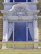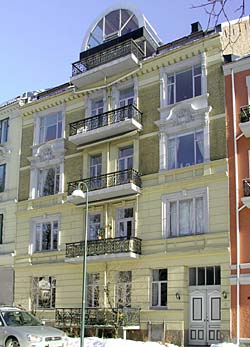 Arkitektur og historie i Oslo: Leiv Eirikssons gate 9 Denne bygnigen ble oppført som leiegård på en parsell av Drammensveien 70 for murmester Axel Olsen i 1898, etter tegninger av arkitekt Ludwig Zapffe. Gården ble bygget med én leilighet i hver etasje, og blant beboerne i år 1900 var grosserer og disponent for Gjøvik Cellulosefabrik Ivar Enger, disponent ved Christiania Baand- og Lidsefabrik Conrad Emanuel Halvorsen og byrettsassessor og ekstraordinær assesor i Høyesterett Herman Scheel. Gården er oppført i pusset tegl, med deler av fasaden i upusset gul tegl. Første og annen etasje danner en sokkel med tung, kvaderpusset fasade. Tredje og fjerde etasje har flater i upusset tegl, og rik ornamentikk i vindusinnfatningene. Gården er utført i nybarokk stil. Fgatefasaden er symmetrisk komponert, med unntak av portrommets plassering. Loftsetasjen har et særegent, postmoderne påbygg, med en markant, rund ark. Loftsetasjens balkong er utført i samme stil som gårdens øvrige balkonger.