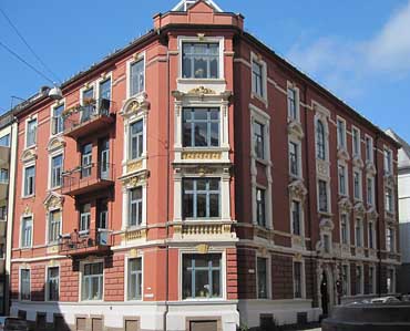 Arkitektur og historie i Oslo: Niels Juels gate 8 Denne hjørnegården til den lille gaten Skillebekk ble bygget i 1895-96, på en tomt skilt ut fra Drammensveien 70, for murmester Axel Olsen ved arkitekt Ivar Cock. Olsen lot oppføre flere gårder i dette området, tegnet av ulike arkitekter. Bjørn Farmanns gate 4 og 6 ble også tegnet av arkitekt Cock. Niels Juels gate 8 er oppført i pusset tegl over fire fulle etasjer, med et brukket hjørne markert av en risalitt i full høyde. Første etasje er kvaderpusset, med unntak av et område hvor denne effekten er fjernet. De øvrige etasjene er bundet sammen i puss- og stukkornamentikken som omgir vinduene. Balustre pryder annen etasjes brystningsfelter, og ellers er både brystninger og overdekninger rikt dekorert. I de asymmetriske fasadene er enkelte akser markert ved gavlformede overdekninger i annen etasje, og avrundede sådanne i tredje. Noen av de avrundede er med tiden falt av eller fjernet. Inngangspartiet og trappegangen vender mot Skillebekk, og danner en egen, markant akse. Stiluttrykket er nybarokk. Gården har gjennom tidene vært utsatt for ganske hard påkjenning. I 1944 ble den underlagt omfattende reparasjoner på grunn av skader forårsaket av Filipstad-ulykken den 19. desember 1943. I 1958 ble den rammet av en brann. Eksplosjonen er nok årsak til de omfattende setningsskadene, samt utskiftningen av balkonger og enkelte av de forandringene som nevnes ovenfor. Senere er loftsetasjen bygget ut til beboelse, blant annet med et iøyenfallende, triangulært glassoppbygg på hjørnet. Ved folketellingen anno 1900 hadde gården 45 beboere fordelt på åtte romslige leiligheter. Blant menneskene her dengang var snekkermester Bernt Hedemark, handelsborgerne Gustav Dahl og Axel Julius Gryn, oljeagent Anders Larsen, isenkramkjøpmann Arild Orning og assuranse- og vareagent Fredrik Kling.