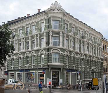 Arkitektur og historie i Oslo: Niels Juels gate 9 Denne hjørnegården ble oppført på en eiendom utskilt fra Munkedamsveien 96b for murmester Emil Christophersen etter byggemelding i 1891 ved den svenske arkitekt Carl Aaman. Gården danner sammen med Munkedamsveien 96 og 98 fasade mot Skillebekkparken. Disse gårdene ble oppført på samme tid, alle tegnet av arkitekt Aaman, tross de store ulikheter i utseende, og alle opprinnelig byggemeldt for Christophersen, som bygget ut store områder på Skillebekk og Grønland, og etter hvert ble teglverkseier og godseier på Melløs (Mjelløs) ved Moss. Niels Juels gate 9 er oppført i pusset tegl over fire etasjer på en rød granittgrunnmur. Gården har et brukket hjørne med hengende karnapp, og dens lengste fasade vender mot Niels Juels gate. Første og annen etasje er utstyrt med kraftige, spisse pusskvadre, med unntak av det området der disse er fjernet i forbindelse med ombygging for butikklokaler. Annen etasjes vinduer har runde overdekninger med kamskjellornamentikk. I tredje etasje er bygningens særegne søylepar mellom vindusaksene, som er rikt ornamenterte og bindes sammen med gavlformede overdekninger mellom vindusaksene. Gavlfeltenes medaljonger er prydet med bokstaven ”C”. I fjerde etasje er overdekningene rette, men ledet opp fra konsoller en meter nedenfor. Fasadekomposisjonen er delvis regelmessig, men preget av en innenfra-og-ut-fordeling. Karnappet har det samme ornamentale utstyr som fasaden ellers, men her er vinduene og medfølgende dekor strukket ut i bredden. Over karnappet troner en brutt gavloverdekning, med skulpturer og rik ornamentikk. Gården er utført i en for Oslo overdådig nybarokk. Flere smijernselementer på takpartiet er dessuten fjernet. Henimot århundreskiftet var gården kommet i G. & P. Gløersens eie. Ved folketellingen anno 1900 hadde huset 43 beboere fordelt på åtte romslige leiligheter. Blant menneskene her på denne tiden var billedskjærersøstrene Dagmar og Ragna Søborg, musiker ved Nationaltheatret Bruno Hamburg, pensjonatvertinne Johanne Bjørnstad, kjøbmand Conrad Lie og infanterikaptein og sekretær i assuransekomiteen Truls Adolf Harald Andersen.