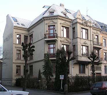 Arkitektur og historie i Oslo: Oscars gate 44 Denne gården ble byggemeldt i 1897 for murmester Harald Kaas ved arkitekt Ludwig Zapffe, på en tomt satt sammen av parseller fra Uranienborgveien 8 og 11 samt Skovveien 31. Ved århundreskiftet tilhørte gården tannlege Carl Kaas, en bror av murmesteren. Christian Eger sto som eier av den ubebygde tomten i 1892. Gården er oppført i pusset tegl over tre fulle etasjer på en høy kjeller, og til tross for at den en beliggende ved et rett gateløp, er den nærmest gitt form av en hjørnegård. Fasadepartiene er asymmetrisk komponert, og forbindes ved et brukket hjørne med smijernsbalkonger. I første etasje er murpussen utført som smale kvaderbånd. Over inngangen, hvor de opprinnelige dørene er tapt, løper et karakteristisk bånd av smale, rundbuede vinduer. I annen og tredje etasje er vindusoverdekningene utført i flere varianter; både buede rette, gavlformede og brutte. Stedvis er disse partiene rikt ornamentert. Bygningens dominerende ledd er det kraftige hengende karnappet. Stiluttrykket er en eklektisk historisme preget av nybarokk. Det ble foretatt endringer i inngangspartiet i 1962, og i 1982 utførte man reparasjoner etter en brann. Ved folketellingen anno 1900 hadde gården 29 beboere fordelt på fire leiligheter. Her bodde gårdeier Carl Kaas med familie, og blant leieboerne var hvalfanger Lauritz Berg, portner Elisæus Vinne og associé i selskapet Conrad Langaard, Otto Grif-Tidemand.