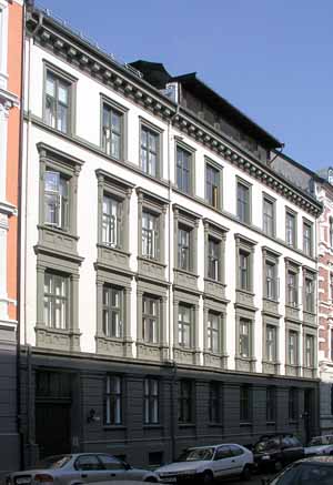 Arkitektur og historie i Oslo: President Harbitz' gate 1 På en parsell av Skovveien 20 byggemeldte J. Hansen denne bygården ved arkitekt Carl Konopka i 1894. Gården er bygget i tegl, med pusset gatefasade i kraftig relieff. Første etasje danner et tungt, kvaderpusset fundament for annen og tredje etasje som er koblet sammen med vindusomrammingene i stukk. Fjerde etasje er meget enkelt utført. Stiluttrykket er nyrenessanse. Ved folketellingen anno 1900 var det 19 boliger i gården, med i alt 94 beboere. Blant dem var gårdens eier, enkefru Oline Jensen, baker Mathias Zakariassen, politibetjent Ole Holm og syerske med eget syetablissement Karen Waal.
