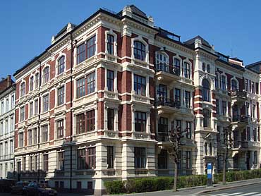 Arkitektur og historie i Oslo: Skovveien 24 Denne hjørnegården til Meltzers gate ble byggemeldt i 1893 på en eiendom utskilt fra Skovveien 25 for byggmester H. Olsen ved arkitekt Kristen Rivertz. Henimot århundreskiftet var gården kommet i Hans Otto Strands eie. Gården er bygget i delvis pusset rød tegl over fire fulle etasjer, men fasader av ikkesymmetrisk karakter. Mot Skovveien er hovedmotivet imidlertid symmetrisk, med en midtrisalitt for inngangsparti og trappegang flankert av vindusakser og balkonger. Balkongene ble det innsendt en særskilt byggemelding for. Første etasje har tidens sedvanlige kvaderpuss, mens de øvrige etasjene er forblendet med rød tegl brutt opp av kraftig artikulert puss og stukk. De tre risalittene er alle forhøyet med lave tårnhetter. Stiluttrykket er en eklektisk historisme preget av nyrenessanse og nybarokk. Balkongene langs venstre akse er satt opp i den senere tid. Ved folketellingen anno 1900 bodde gårdeier Hans Otto Strand her med sin familie. Han var også kasserer ved Fortuna & Central Bryggeri. Blant de øvrige beboerne var den velstående enken Adolfine Fick, isenkramkjøpmann Birger Dethloff og innehaver og sjef for herreekviperingsforretningen Parisermagasinet i Akersgaten 20 Ole Johan Olsen. Mye av gården var tatt i bruk av enkefru Othilie Stenersen som pensjonat. Blant hennes leietagere på denne tiden var mange svært tilårskomne kvinner. Gårdens loftsetasje ble i 1983 innredet til leiligheter.