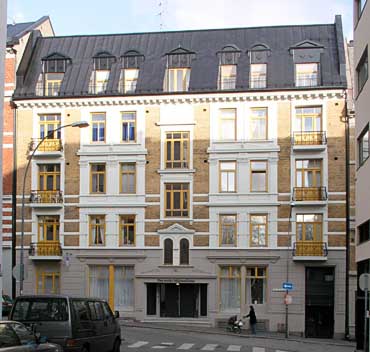 Arkitektur og historie i Oslo: Sven Bruns gate 9 Denne leiegården ble oppført i 1897-98 for malermester og eiendomsspekulant Jens Jacobsen Krogstie ved arkitekt Niels Stockfleth Darre Eckhoff, på en tomt utskilt fra Hegdehaugsveien 10. Jens Krogstie var en av sin tids ivrigste utbyggere av leiegårder i Kristiania, og gikk konkurs ved Kristianiakrakket i 1899. Han trakk seg tilbake til sin gård Østre Greverud i Oppegård, der han hadde fått oppført en hovedbygning i 1890 og et teglverk i nærheten. I 1899 tilhørte Sven Bruns gate 9 et konsortium ledet av en fru Jensen. Gården er oppført i pusset og upusset tegl over fire fulle etasjer, med en høy loftsetasje over. Gatefasaden er symmetrisk komponert med smale sideakser og smal midtakse. Første etasje avviker stedvis fra symmetrien, er enkelt artikulert i kvaderpuss, og har gjennomgått flere forandringer, spesielt i midtpartiet. Sideaksene har spinkle, sirlig artikulerte smijernsbalkonger, mens den smale midtaksen rommer hovedtrappens vinduer. Mellompartiene har partstilte vinduer, og er tungt markert med puss og stukk. I tredje etasje er vinduene flankert av brede pilastre med stiliserte, joniske kapiteler. Storparten av gatefasaden er forblendet med gulaktig teglsten. Stedvis er teglflatene brutt opp av horisontale, pussede bånd. Stiluttrykket er nyrenessanse. Ved folketellingen anno 19 bodde i alt 54 personer fordelt på denne adressens åtte husstander. Blant beboerne her på denne tiden var kjøbmand Carl Oluf Olsen, bokhandler Nils Jørgen Irgens, pensjonatvertinne Wilhelmine Foss, agent i tran og nordlandsartikler Christian Hansen og frisører hos ”Chik” Ellen og Anne Marie Johansen.