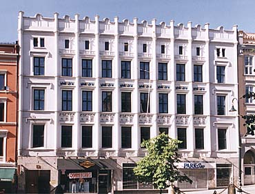 Promenade langs Karl Johans gate: Hoppegården, Karl Johans gate 12 Karl Johans gate 12 ble oppført etter bybrannen i 1858, for bokbinder Johan Christian Hoppe. Bygningens arkitekter var Heinrich Schirmer og Wilhelm von Hanno. Hoppegården utmerker seg spesielt ved å være utstyrt med en liten femte etasje. Selve fasadeartikuleringen er også ganske uvanlig, idet den er satt opp som et rutenett dannet av pilarer og gesimser. Pilarene bryter også igjennom takgesimsen og attikaoppbygget, for å danne små spir over fasaden. De delikate stikkbuevinduene første etasje opprinnelig var utstyrt med er dessverre borte. Fasadens flanker fremheves ved en luftigere komposisjon. Bygningen er preget av nygotiske detaljer, men komposisjonen er ellers strengt symmetrisk, preget av senklassisismen. I gården drev Hoppe sin bokbindervirksomhet, og i en bakbygning hadde han sitt trykkeri. Hoppe lot dessuten oppføre den såkalte Fabritiusgården i Øvre Slottsgate 25 i 1854. Hoppes enke Emma Marie Theresie (f. Winther) solgte i 1866 denne til Wilhelm Christian Keilhau Fabritius, som selv etablerte et kjent trykkeri i Fabritiusgården allerede idet den sto ferdig. Enkefru Hoppe fortsatte som eier av Hoppegården i en årrekke. Christiania Kunstforening var leietager hos Hoppe fra 1859; de ble her til 1870. Senere fentes blant andre Fillingers hotell og Hotell Atlas i gården. Hotellvirksomheten opphørte først i 1972.