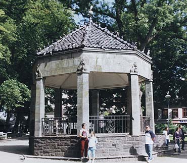 Fra Stavangers murarkitektur: Musikkpaviljongen, Byparken Det ble i 1915 holdt en arkitektkonkurranse for utforming av en musikkpaviljong ved Stavanger Domkirke. Arkitekten Erling Nielsen og hans assistent Johan Stølan i Kristiania gikk seirende ut av konkurransen med utkastet "Netop", og dette dannet også grunnlaget for paviljongen som ble bygget. Paviljongen er en oktogonal, søylebåren konstruksjon i natursten, med valmet, enkelt tak. Smijernsgelendrene var ikke med i arkitektenes konkurranseutkast, og er nok påvirket av annenpremieutkastet "Mon Plaisir", utformet av arkitektene Morgenstierne & Eide. Musikkpaviljongen er utført i nordisk nybarokk.