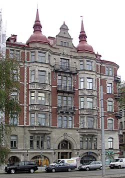 Fra Stockholms arkitekturhistorie: Strandvägen 9 Denne gården ble oppført i årene 1897-1900 for byggmester N. J. Bengtsson, som også var ansvarshavende ved byggingen. Gårdens arkitekt var Johan Laurentz. Laurentz og Bengtsson var også involvert i byggingen av Strandvägen 17 i 1895. Like etter leiegårdens ferdigstillelse ble eiendommen solgt til friherre Carl Carlsson Bonde, som omgjorde gården til adelig fideikommiss. Dette ble imidlertid opphevet i 1964. Blant de første leieboerne her var den berømte finansmannen Ernest Thiel. Huset har en todelt komposisjon, der en tung sokkel dannes av en høy kjeller og første etasje, med fasade i finhuggen kalksten på et fundament i granitt. Fasadene forøvrig er i rød tegl og finhuggen kalksten. Hovedfasaden er symmetrisk komponert, med to dominerende akser som utgjøres av polygonale karnapper med tårnoppbyggg og barokkspir. Midtaksen understrekes av et høyt gavloppbygg, og hjørnet er svakt avrundet. Gården er utført i en eklektisk historisme, dominert av renessanse og barokk, med innslag av jugend.