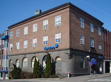 Murarkitektur i Tønsberg: Tønsbergs Industri- og Sjøfartsbank, Storgaten 20 Tønsbergs Industri- og Sjøfartsbank ble opprettet i 1917, og hadde de første årene lokaler i Storgaten 17. I 1922 flyttet banken til sitt nyoppførte forretningsbygg i Storgaten 20, bygget etter arkitekt Kristofer Langes tegninger. Bankbygningen danner et hjørne mot Conradis gate, og er oppført med en tung førsteetasje forblendet med larvikitt. Første etasje har et avrundet hjørne, som går over i en rett vinkel i etasjene ovenfor. Denne forskjellen utlignes av en grotesk, hornblåsende englefigur. De to øverste etasjene har fasader i rød tegl. Den korte fasaden mot Storgaten danner bygningens hovedmotiv, med en diskret markert portal. Fasadene er nøkterne, med en pseudosymmetrisk utførelse der aksene er jevnt fordelt, men likevel forskjøvet i forhold til bygningskroppen. Stiluttrykket er en stram nyklassisisme myknet opp med nybarokke trekk. Sentral i bankens tidlige år var høyesterettsadvokat Odd Nerdrum, som var viseformann ved stiftelsen, og siden formann i direksjonen. Banken opprettet tidlig en filial i Oslo. Bygningen i Tønsberg har hele tiden huset ulike banker, og er også blitt utvidet til å omfatte hele kvartalet, dog med temmelig kontrasterende bygninger.