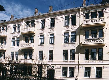 Jugendstil i Oslo: President Harbitz' gate 23 Denne store leiegården ble oppført i 1898 for byggmester Johannes M. Narvestad fra Eidskog. Arkitekt var Oskar Dehkes. Den lange fasaden er først og fremst preget av den sene historismens håndtering av middelalderske former, men huset har likevel et visst preg av jugendstil, om enn ganske lite. Balkongene er utformet på samme måte som de i Oscars gate 43 (arkitekt Oscar Hoff), der Dehkes sannsynligvis var delaktig. Fasaden hadde opprinnelig gotiskinspirerte arker, men disse er fjernet. Det har bodd etterkommere av byggmester Narvestad i gården i 100 år.